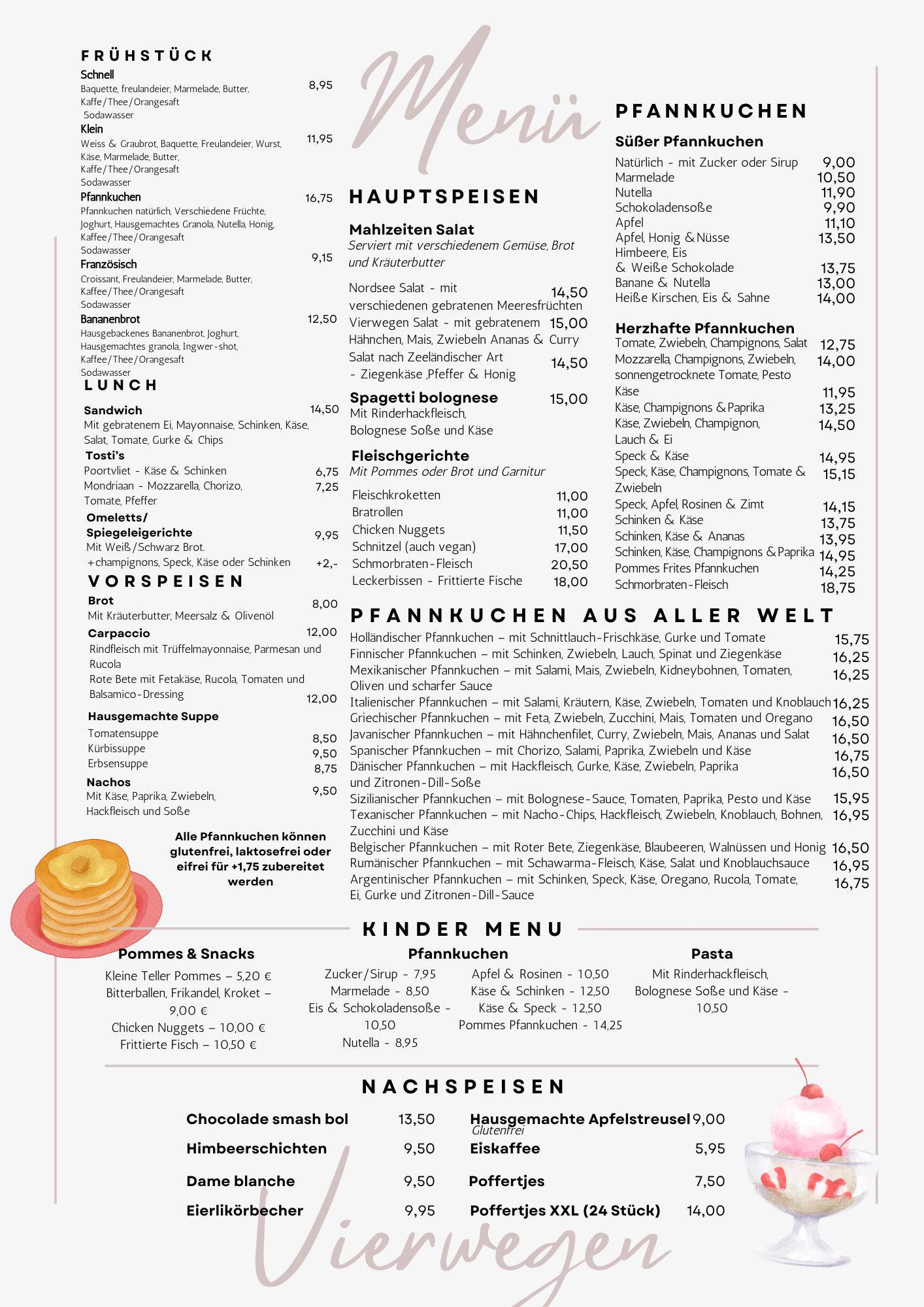 Auf unserer menukarte finden Sie eine umfangreiche Auswahl an köstlichen Pfannkuchen, von klassischen Favoriten bis hin zu kreativen und überraschenden Variationen. Egal, ob Sie Lust auf eine süße Köstlichkeit oder eine herzhafte Leckerei haben, unsere Pfannkuchen werden stets frisch zubereitet und mit den besten Zutaten versehen.